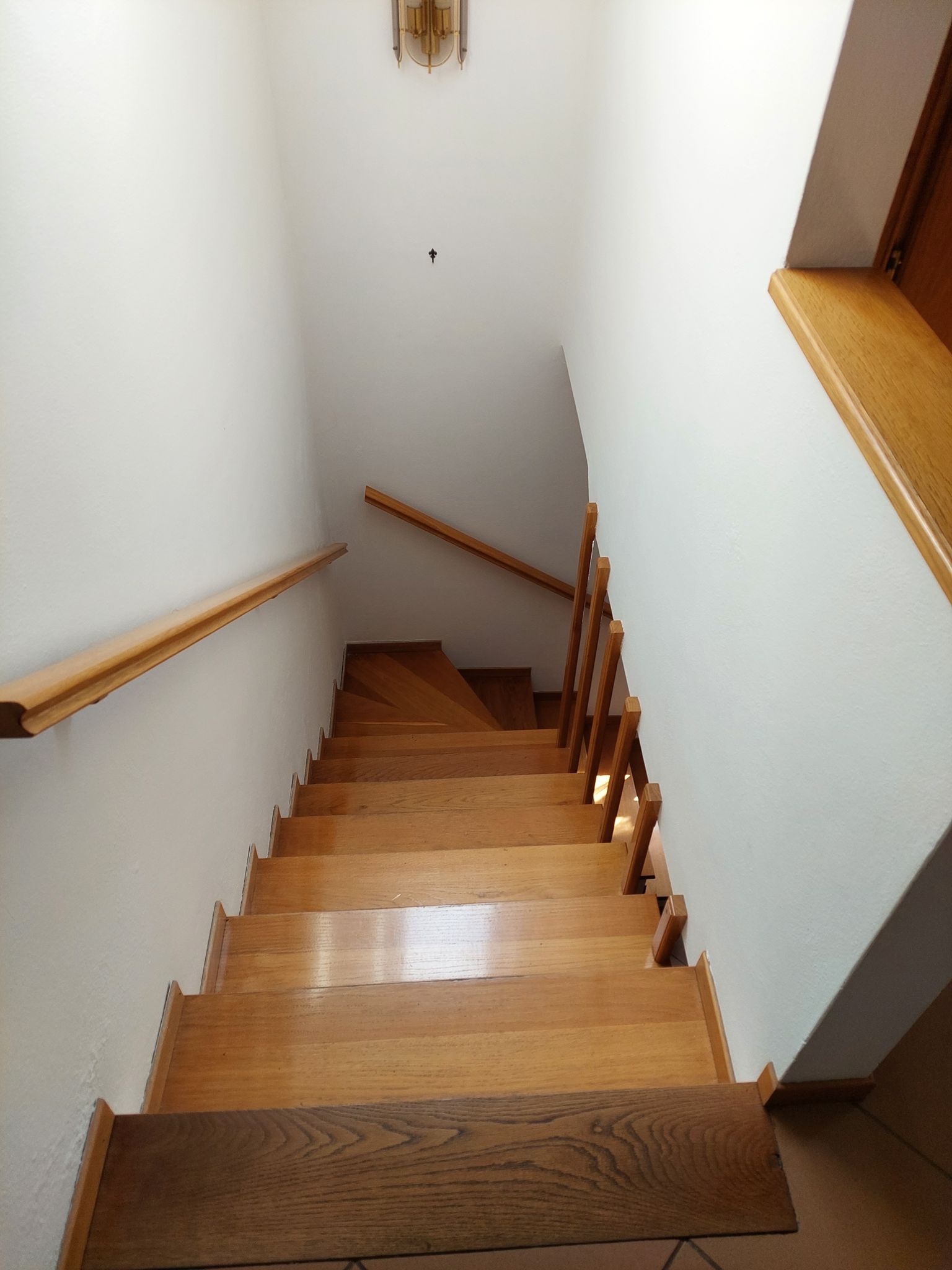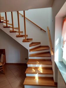 Una comoda scala in legno conduce al piano superiore, dove si trovano due ampie camere da letto e un secondo bagno.